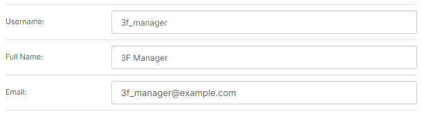 Full Name 3F Manager A display name for the user, such as their full name. The full name should be less than or equal to 100 characters in length. Email 3f_manager@example.com The email address to be used for password recovery and license expiry notification. Please specify a valid email address.