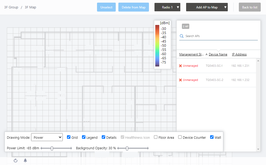 The "Add AP to Map" view will appear. A list of APs in the same management group as the map are shown on the right side of the screen.