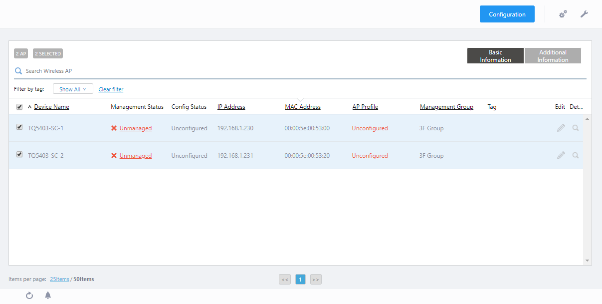 - When you are back to the AP list screen, you can see that the target APs' "Management Status" and "Configuration Status" were changed to "Searching" and "Modified" respectively.