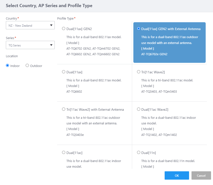 Location If the Profile Type is "Dual[11ax] GEN2 with External Antenna", "Tri[11ac Wave2] with External Antenna" or "11ac with External Antenna", select Location ("Indoor" or "Outdoor") to place the Wireless APs. "OK" button Create an AP Profile of the selected Profile Type. "Cancel" button Stop adding an AP Profile. - TQ Series:
