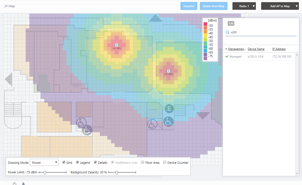 The heatmap calculates the radio signal strength at a given point from an AP's transmit power and the distance between the AP and the point. Because it assumes that there are no obstacles and reflection between the AP and the point, the actual radio signal strength may differ from the heatmap's calculation.