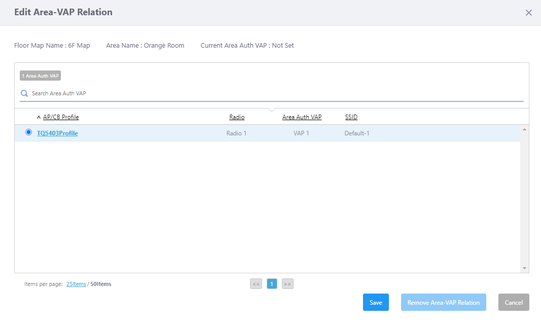 In the "Edit Area" view of the floor map details, select the appropriate area from the area list and click the "Area Auth" button to display the "Edit Area-VAP Relation" dialog.