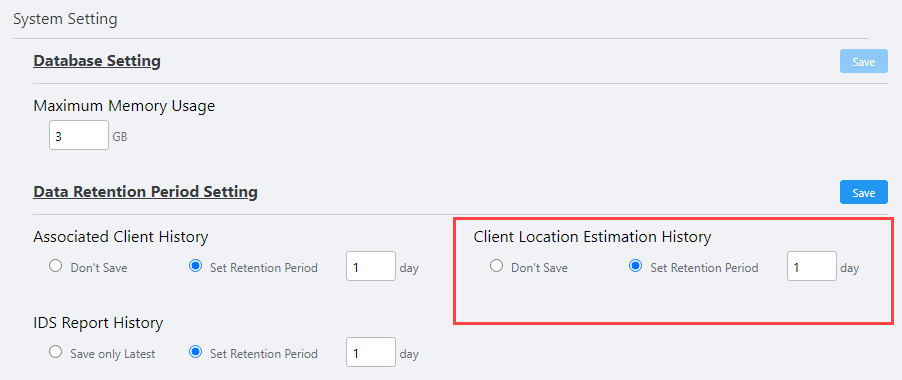 - "Associated Client Location Estimation History" is set effectively in the System Setting screen.