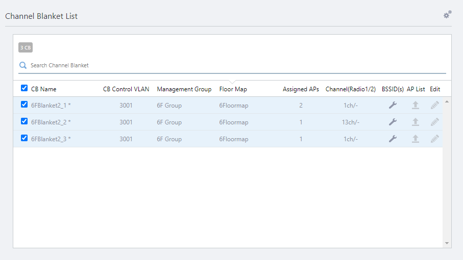 | Search Channel Blankets | Filter entries in the list by entering a partial string in the search box. The Search field lets you enter a partial string to match. The screen displays entries with that string in one of the following fields: "CB Name", "SSID", "CB Profile Name". To remove the filter, delete the string from the Search field and press Enter. NoteThe search is case-sensitive. |