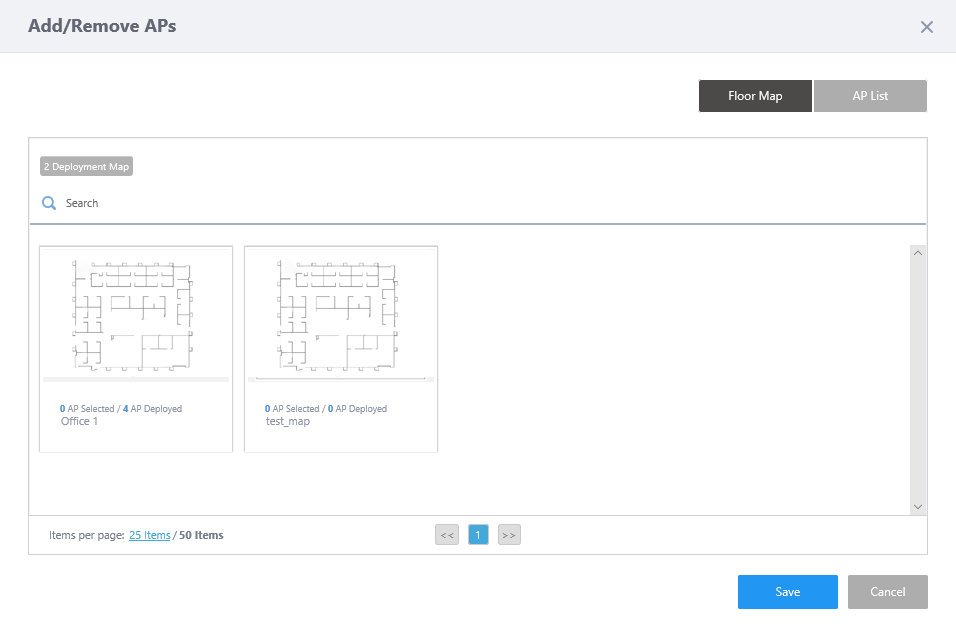 X Deployment Map Shows the number of floor maps. Search Floor Map Filter entries in the list by entering a partial string in the search box.