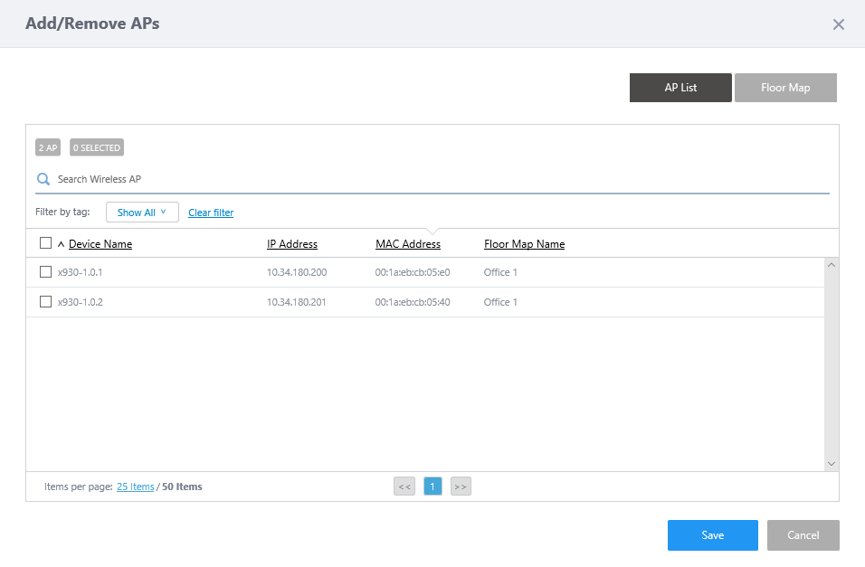 The "Add/Remove APs" dialog box will appear.Search Wireless AP Filter entries in the list by entering a partial string in the search box.