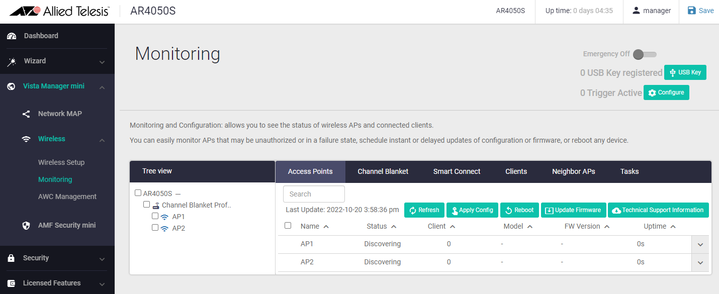 You will need the Wireless LAN Controller "Vista Manager mini" registered in the Remote Monitor screen of the AWC Plug-in.It supports the following devices that are compatible with Vista Manager mini and the AlliedWare Plus version 5.5.1-1.1 or later firmware is applied.