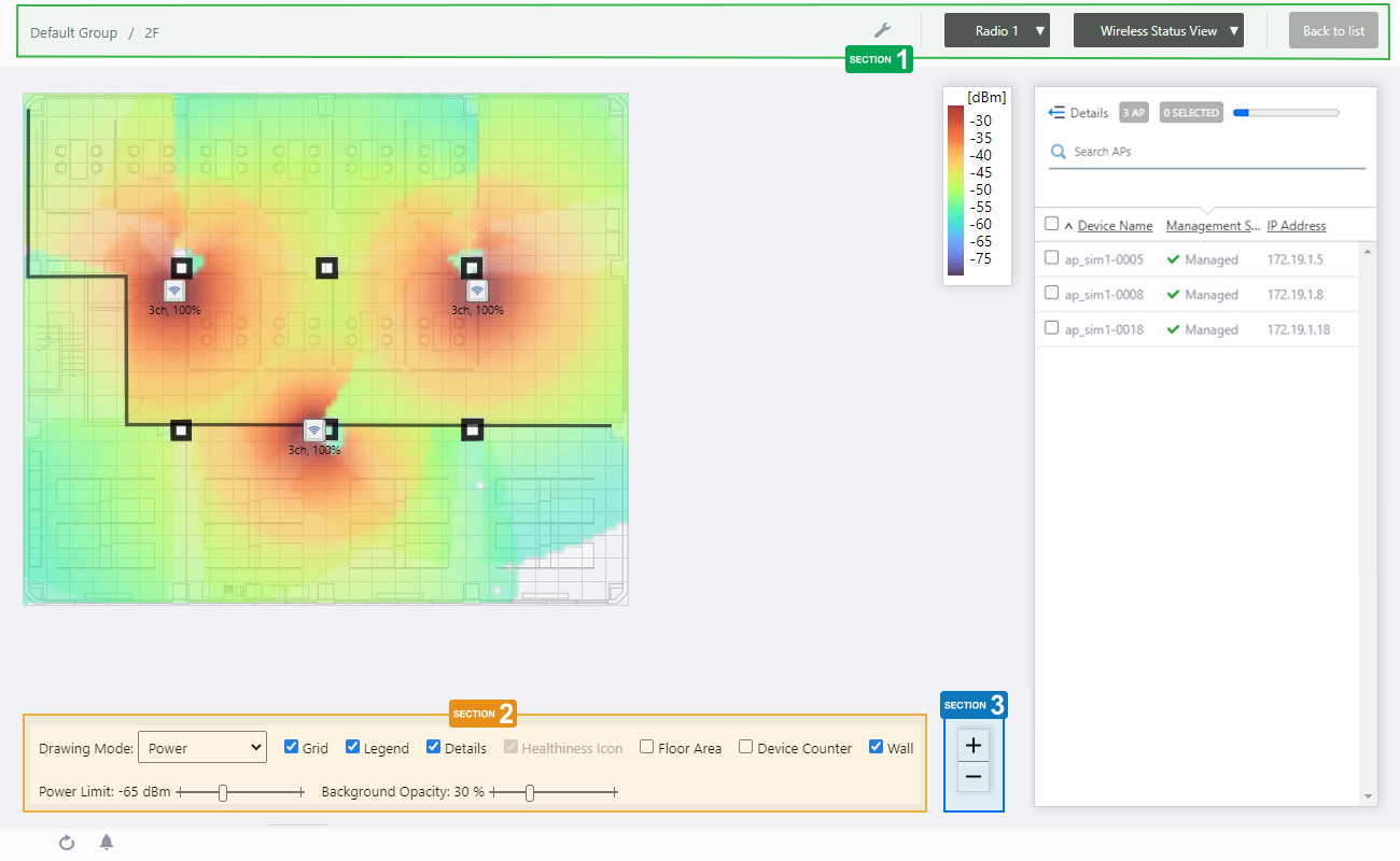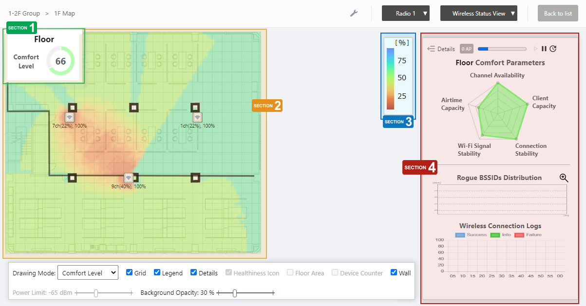 In the floor map control described below, you can switch between Comfort Level, Power, and Channel modes from the Drawing Mode drop-down menu.