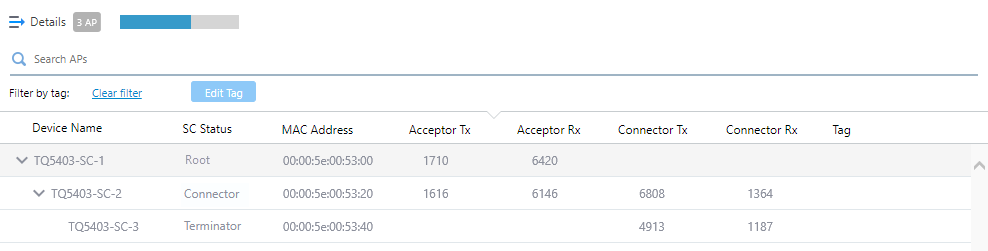 | Details | Clicking this shows Acceptor and Connector Tx / Rx Bytes per second and tags, in addition to the default items (Device Name, SC Status, and MAC Address). Clicking Details again returns you to the default non-detailed view. |