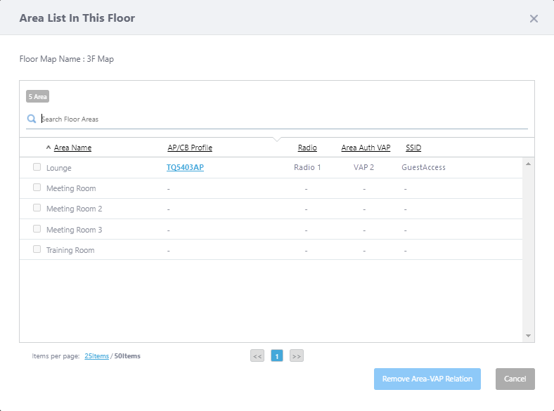 | "Area List" button | Opens "Area List In This Floor" dialog box. ![]() Lists all the areas created on this floor map, along with information of Area Authentication VAPs associated with each area.