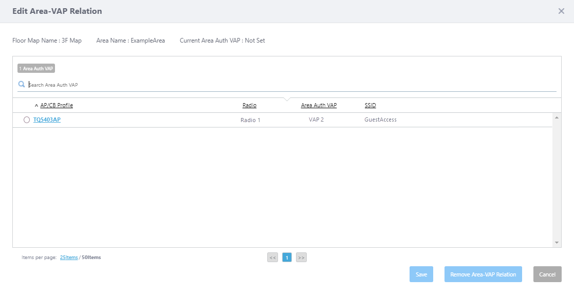 | "Area Auth" button: | Opens "Edit Area-VAP Relation" dialog box to select the Area Authentication VAP you want to set available only in the area. The "Area Auth" button will not be enabled while you are just creating a new area, that is, the button will be enabled once you add and select an area. ![]() The Area Authentication VAP means the VAP whose "Area Authentication" option is enabled in AP Profile or CB Profile. By associating the area with the Area Authentication VAP, only wireless clients whose locations are estimated as in the area can be allowed to connect to the VAP. Only one Area Authentication VAP can be associated to a single area.