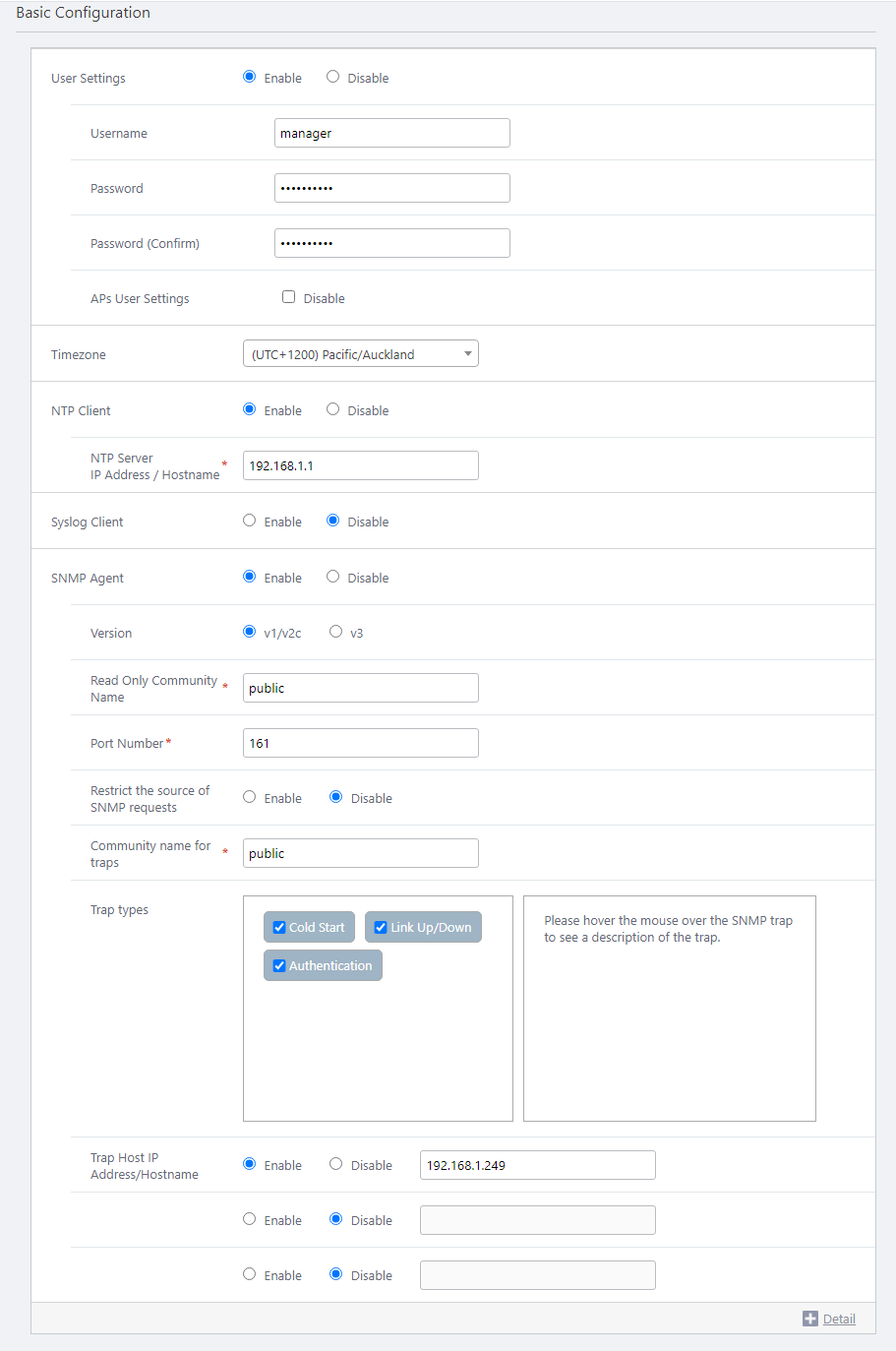 - Clicking "+ Detail" will show "NTP Synchronization Interval" below "NTP Client", and "MAC Address List", "LED", and "Virtual IP Address for Captive Portal" at the bottom.