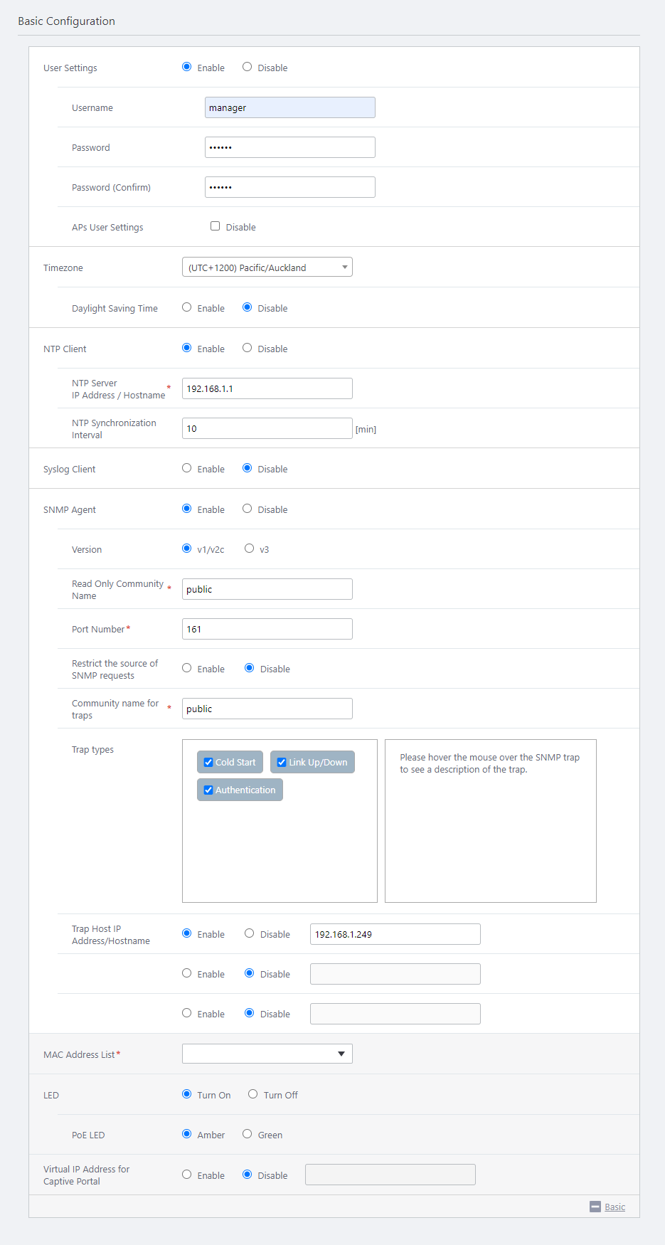 - You can specify the AP's system settings in the "Basic Configuration" section.