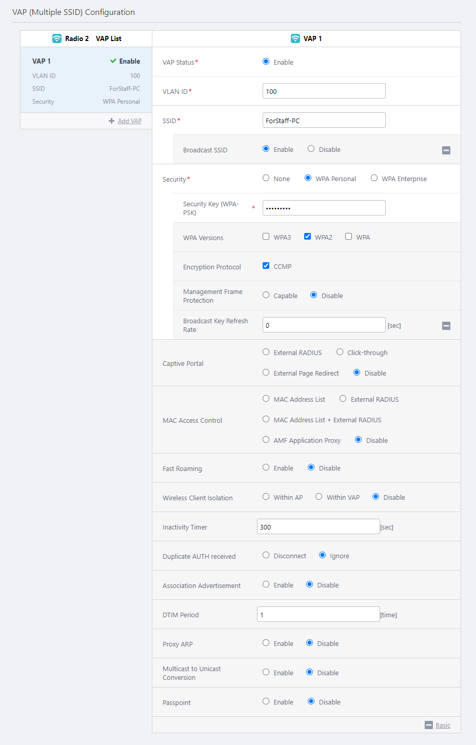 SSID ForStaff-PC Specify an SSID (network name) to use on the VAP. Broadcast SSID Enable Specify whether to broadcast the SSID on the VAP. Security WPA Personal Specify a security method for the VAP. Security Key (WPA-PSK) 5+@f/=0N1y Specify an encryption key for the VAP. WPA versions WPA2 Specify a WPA version to use on the VAP. Encryption Protocol CCMP Specify an encryption protocol to use on the VAP. Management Frame Protection Disable Specify whether to protect management frames from eavesdropping and forging. Broadcast Key Refresh Rate 0 Specify an interval at which to refresh the broadcast key that is sent to clients on the VAP. Specifying "0" stops the key from refreshing. Captive Portal Disable Specify whether to use the Captive Portal feature on the VAP. MAC Access Control Disable Specify whether to use MAC Access Control on the VAP. Fast Roaming Disable Specify whether to use Fast Roaming of wireless clients. Wireless Client Isolation Disable Specify whether to block communication between wireless clients connected to the same VAP.