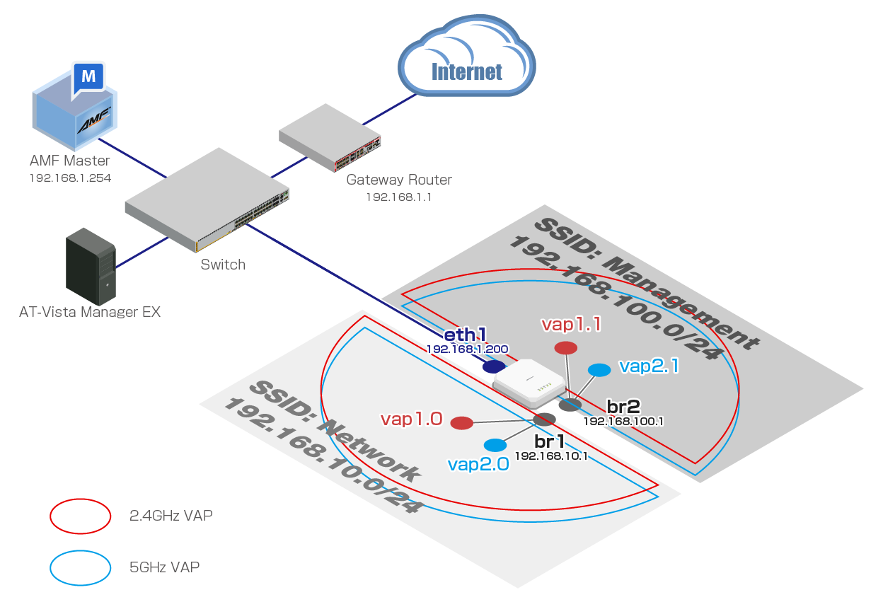 In this example, two VAPs with the same SSIDs are created, both in the 2.4GHz band and the 5GHz band, and four VAPs are grouped into two IP segments by SSIDs. The firewall will block wireless communication between the different segments and only allow communication from each segment to the Vista-managed AMF network, including Internet access.