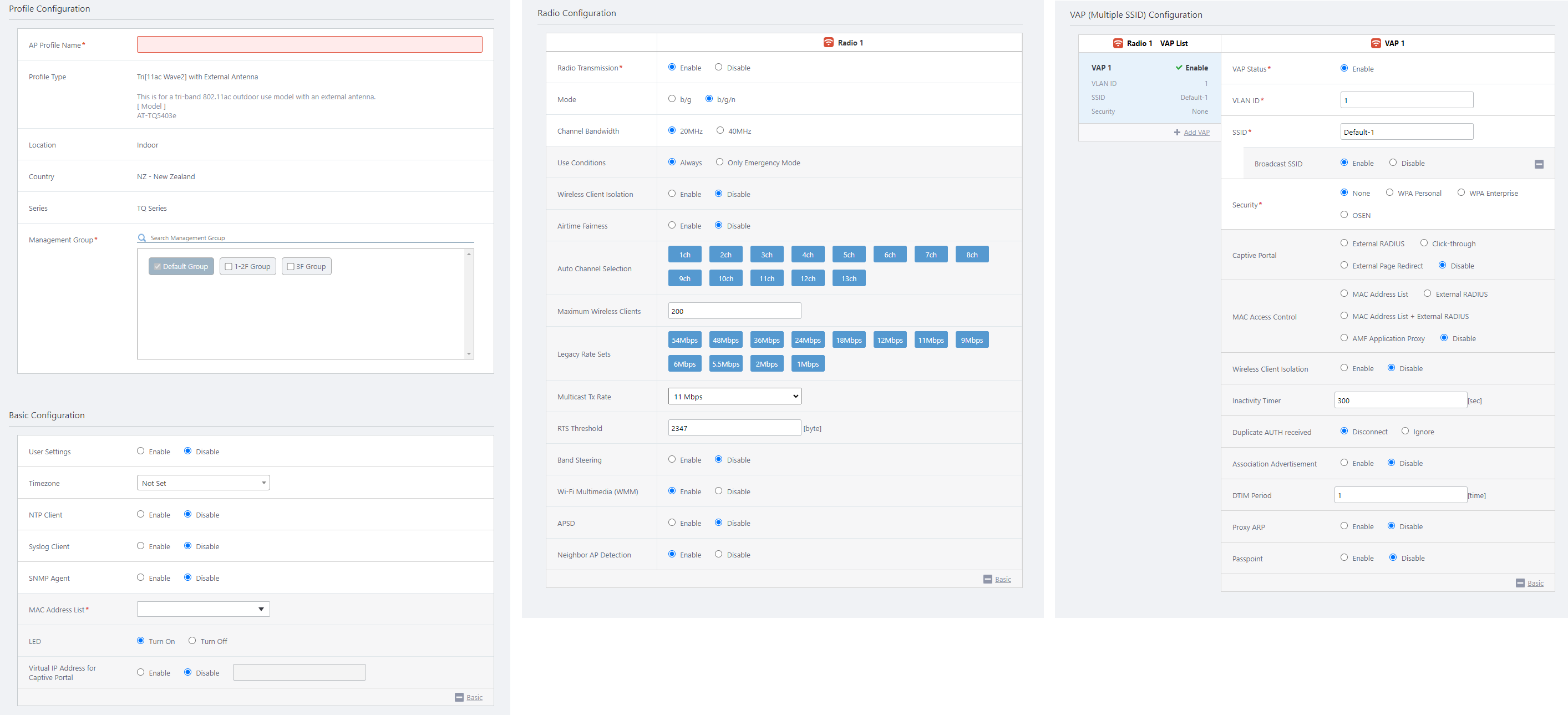 Configuration items of an AP Profile may vary depending on "Series" and "Profile Type". The following image shows a sample AP Profile for "TQ Series" / "Tri[11ac Wave2]".