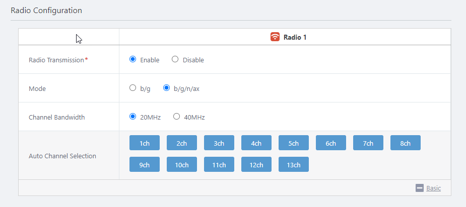 You can specify the AP's system settings in the "Basic Configuration" section.NoteFor the profile type "Dual[11ax] GEN2-R", there are no items that can be set from the AWC Plug-in. The AP can only be configured via the CLI or Web GUI of the wireless AP itself.