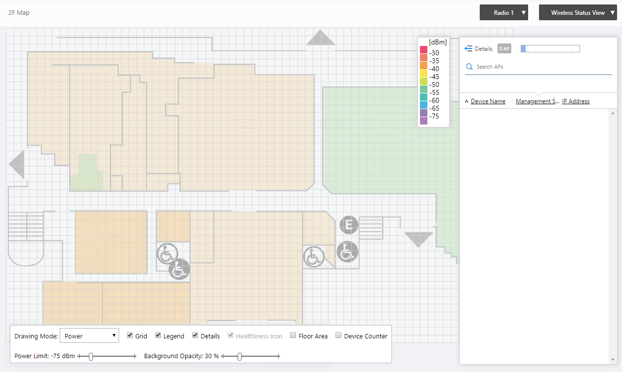 The heatmap calculates the radio signal strength at a given point from an AP's transmit power and the distance between the AP and the point. Because it assumes that there are no obstacles and reflection between the AP and the point, the actual radio signal strength may differ from the heatmap's calculation.