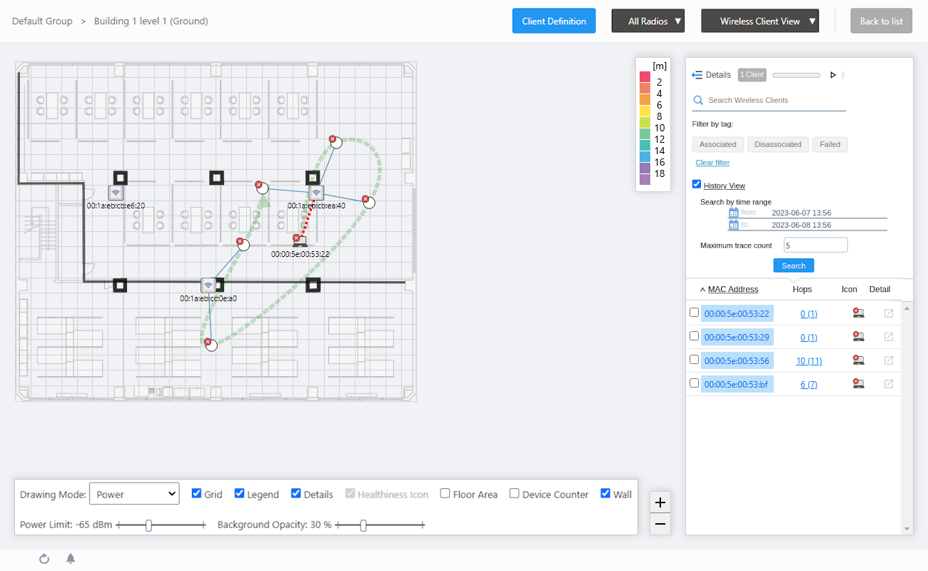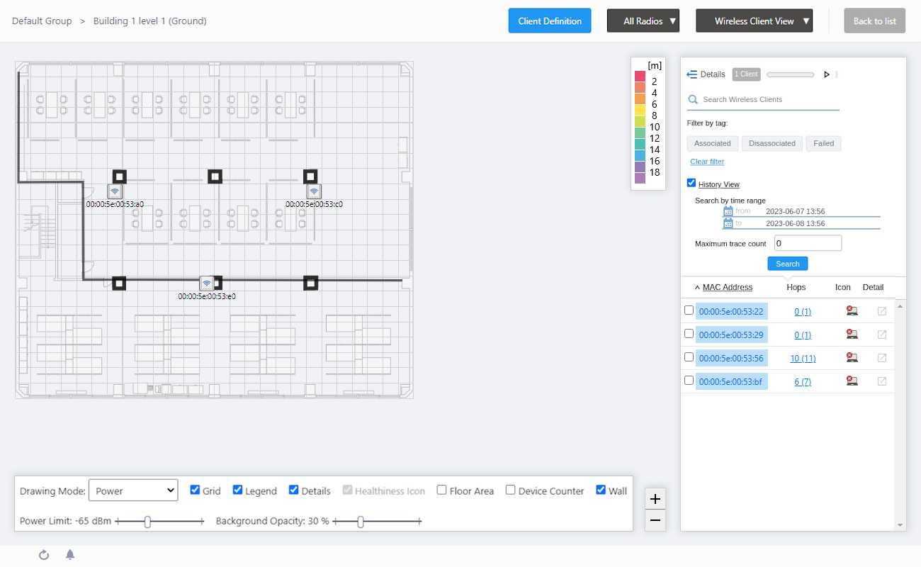 - The MAC and IP addresses of all the associated/disassociated/failed clients on the map will be shown in the client list at the right side of the Content section.