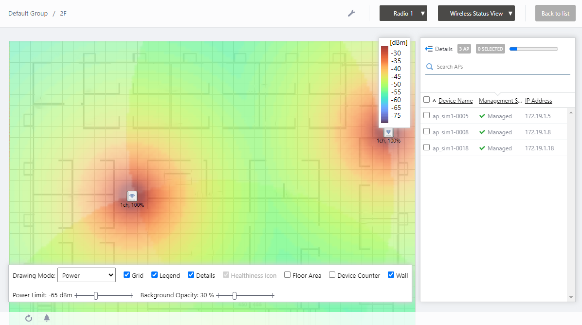 | Details | Click to return to the list display of Status, Floor Map Name, and Management Group Name. The Floor Map Panels will also be displayed on the left side of the Contents section. |
