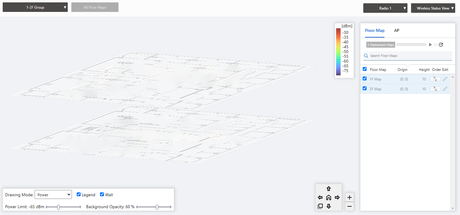 You can select the floor map to be displayed from the management group drop-down menu and Floor Map drop-down menu in the header of the Floor Map list.If you select multiple Floor Maps in the same management group, you can view the layered view of the Floor Maps in 3D.