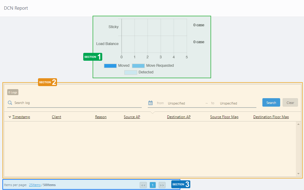 | Search Log | Lets you filter the list of log entries. Filter entries in the list by entering a partial string in the search box. The Search field lets you enter a partial string to match. The screen displays entries with that string in one of the following fields: "Detected Time", "Floor Map" or "Management Group". To remove the filter, delete the string from the Search field and press Enter. NoteThe search is case-sensitive. |
