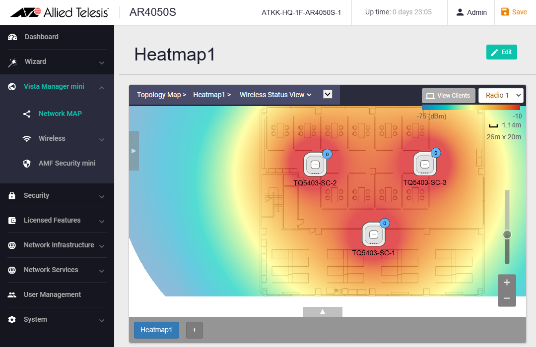 NoteThe heatmap calculates the radio signal strength at a given point from an AP's transmit power and the distance between the AP and the point. Because it assumes that there are no obstacles and reflection between the AP and the point, the actual radio signal strength may differ from the heatmap's calculation.