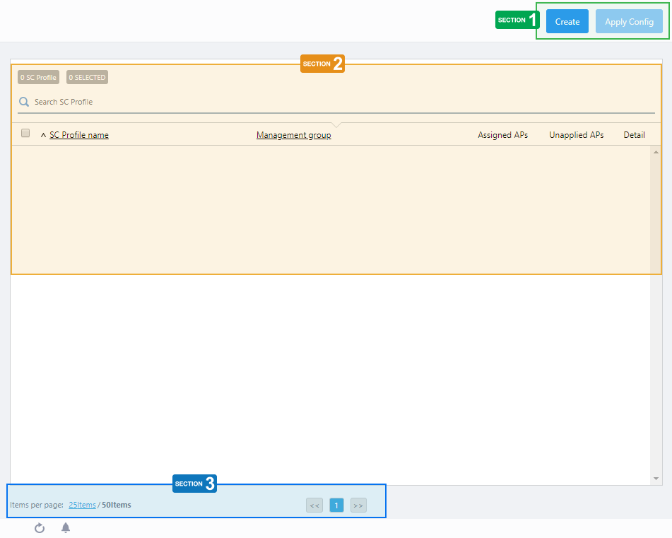 This page allows you to create, edit, and delete SC profiles, and apply configurations to the APs selected as the targets of an SC profile.