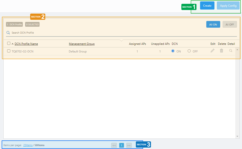 | All ON/All OFF buttons | Turn all DCN profiles ON or OFF. To apply the changes, you must tick the checkbox for the target DCN profile and then "Apply Config". |