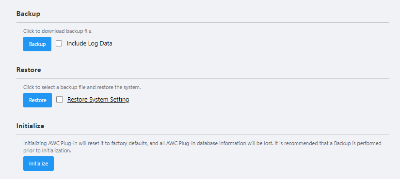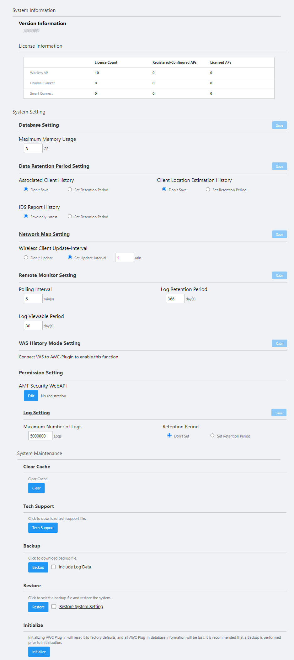 The System Setting page lets you see the AWC Plug-in version, factory-reset the plug-in, and configure system settings.