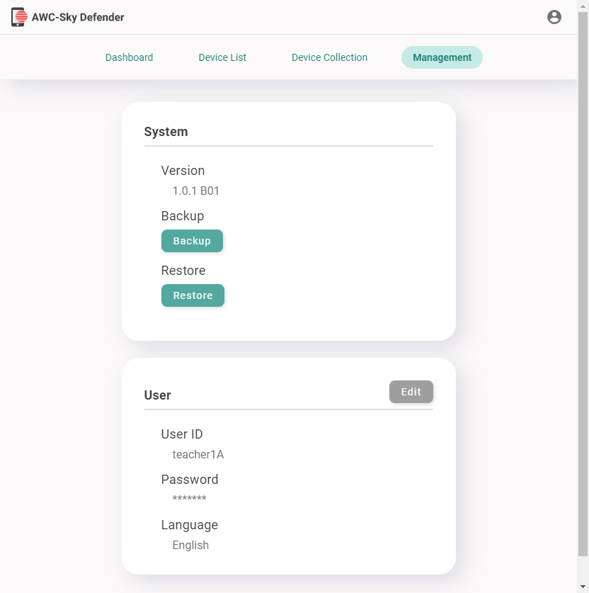 | "Edit" | Lets you change the user passwords and display language. |