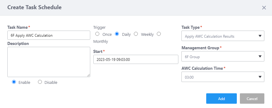 Here we set "AWC Calculation Time" to "03:00". That means the AWC results calculated at 3 a.m. will be applied by the task scheduled at 3 p.m. every day.