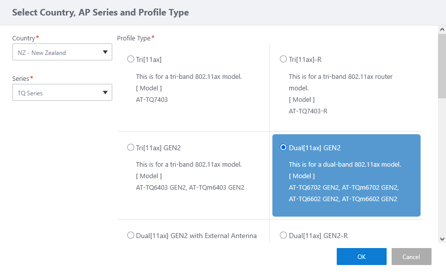 The "Select Country, AP Series and Profile Type" dialog box will appear.