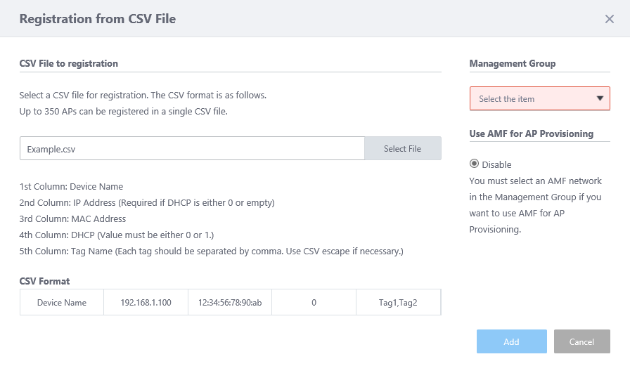 The default is "Disable"."Add" button Register APs from the specified CSV file. "Cancel" button Cancel registering the APs. Note
