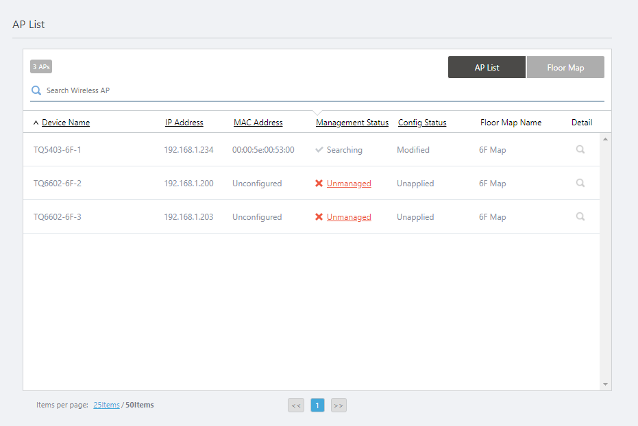 | Details (magnifying glass icon) | Shows the AP Details page. Refer to Operation Reference > Wireless Configuration > View AP Information for more details of the "AP Details" page. |