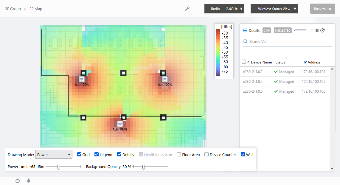 | Details | Click to return to the list display of Status, Floor Map Name, and Management Group Name. The Floor Map Panels will also be displayed on the left side of the Contents section. |