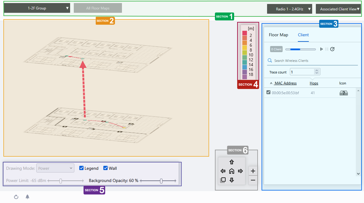 | Trace count | Specifies the number of client movement histories to be reflected in the flow lines on the floor map. In the case of wireless clients whose location is estimated by Location Estimation, the floor map will reflect the estimated location for the specified number of times from the history of location estimation performed. Only wireless clients with Location Estimation results are displayed in the movement path. |