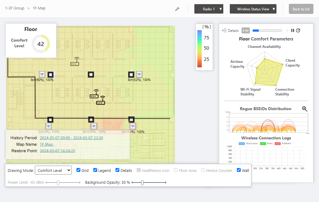 The Wireless Status View also supports heatmap display of Comfort Level, Power (signal strength) and Channel modes.