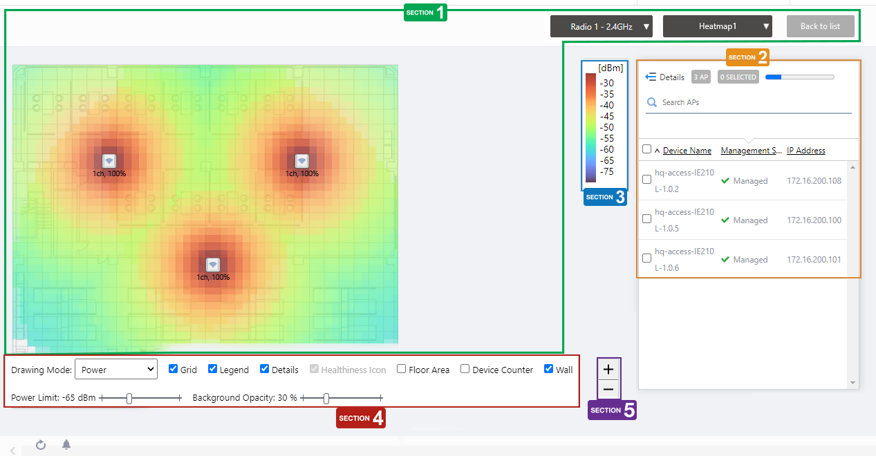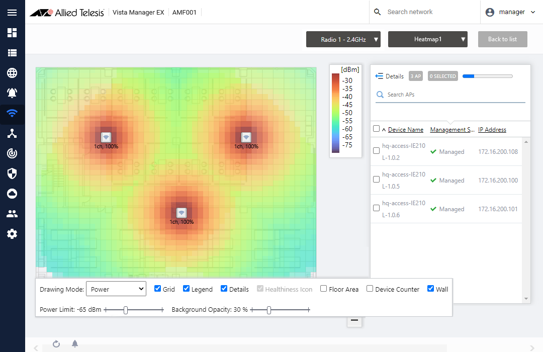 NoteThe heatmap calculates the radio signal strength at a given point from an AP's transmit power and the distance between the AP and the point. Because it assumes that there are no obstacles and reflection between the AP and the point, the actual radio signal strength may differ from the heatmap's calculation.