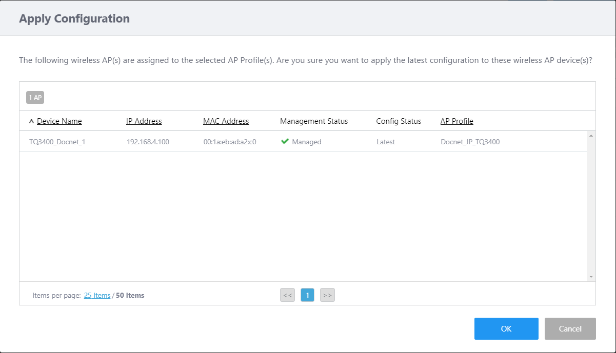 | "Apply Config" button | Opens the "Apply Configuration" dialog box. This allows you to apply changes to the selected AP Profile to APs which have been assigned the AP Profile.![]()