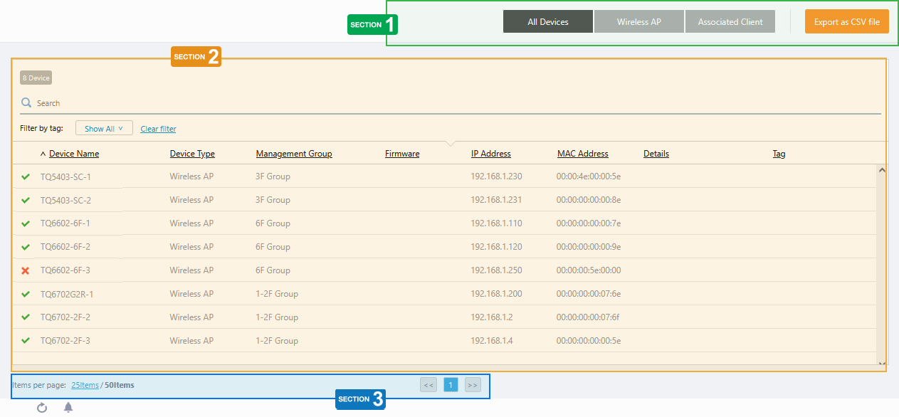 | Tags (Filter) | Shows a list of tags that are attached to the devices. |