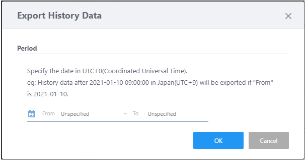 | "Export" button | Displays "Export History Data" dialog box. ![]() Download history data from the VAS selected in the VAS list, specifying the period. The format of the file name is "export_vas_atawc-X.X.X_-YYYYMMDDhhmmss.zip".