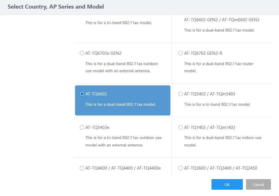 - The "Model", "Country" and "Series" fields show the options selected in the earlier "Select Country, AP Series and Model" dialog box.