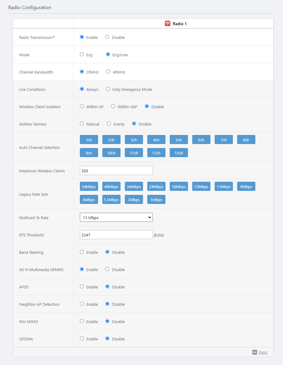 Refer to Enable Emergency Mode for more details.Wireless Client Isolation Disable Disable Specify whether to block communication between wireless clients connected to the same VAP. Airtime Fairness Disable Disable Specify whether to give each client an equal amount of airtime regardless of its speed. Auto Channel Selection All All Specify the channels to use. All channels are selected by default. Maximum Wireless Clients 200 200 Specify the maximum number of clients that can connect to the APs. Legacy Rate Sets All All Specify valid rates to use when IEEE 802.11b/g or IEEE 802.11a is being used. Multicast Tx Rate 11 Mbps 6 Mbps Specify a selection method for IEEE 802.3 multicast/broadcast rate. RTS Threshold 2347 2347 To transmit RTS packets in IEEE 802.11b/g/a mode, select Enable and specify the minimum size of Tx packets. Band Steering Disable Disable Specify whether to use the Band Steering feature, which encourages clients supporting both 2.4GHz and 5GHz to prefer 5GHz in order to reduce congestion in 2.4GHz.