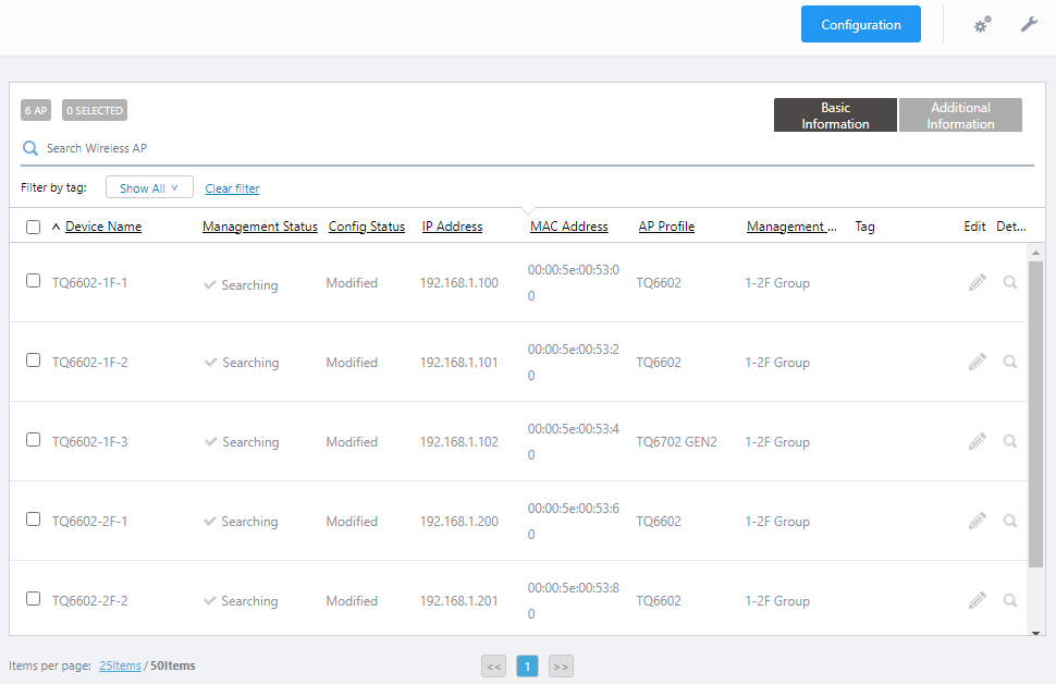 - On the AP list screen, you can see that the target APs' "Management Status" and "Configuration Status" were changed to "Searching" and "Modified" respectively.