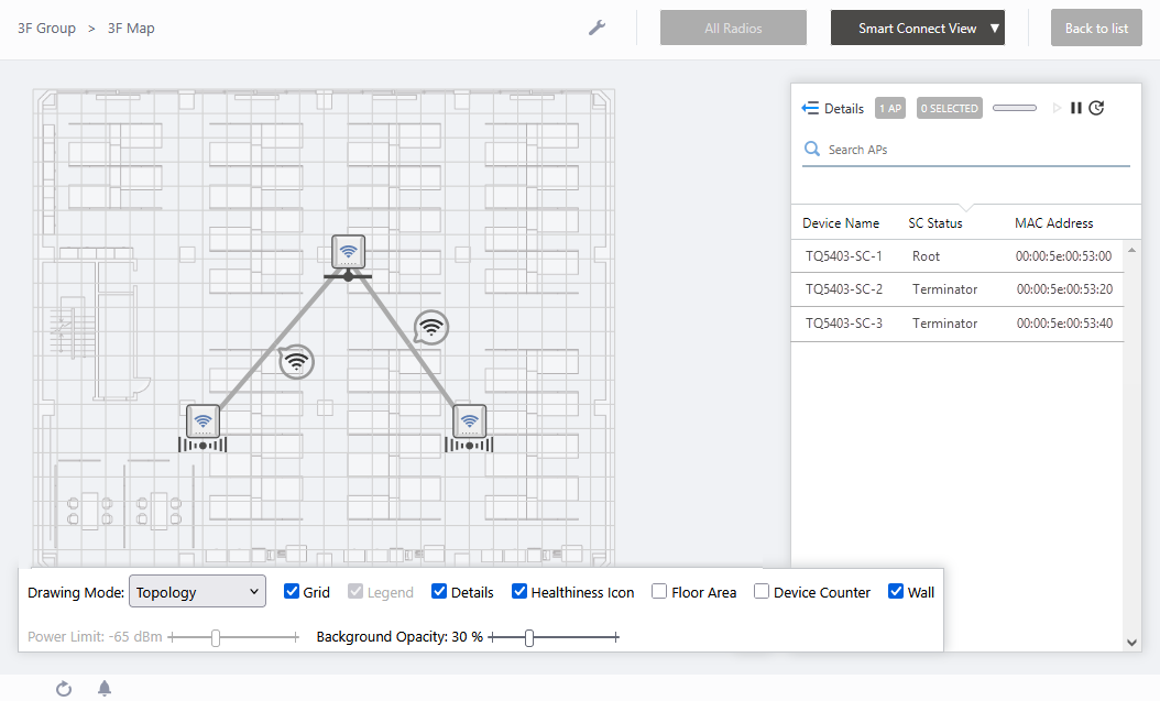 If the AWC-SC is correctly configured, the Details [Smart Connect View] of Floor Map screen allows you to graphically check the status of wireless connection between APs by AWC-SC.