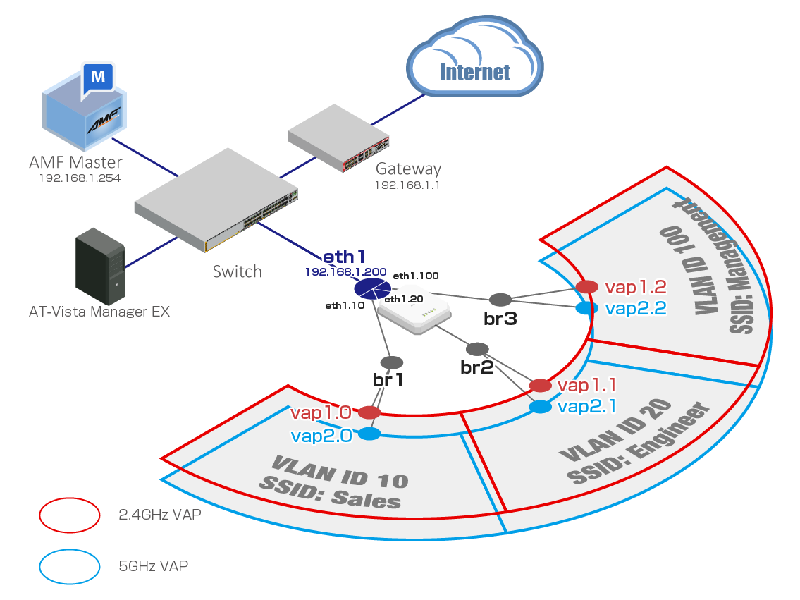 Each VAP communicates with the wired network side via a bridge interface. In this case, an 802.1Q Ethernet sub-interface is created on eth1 interface in order to send and receive communications from the VAPs as packets with different VLAN tags.