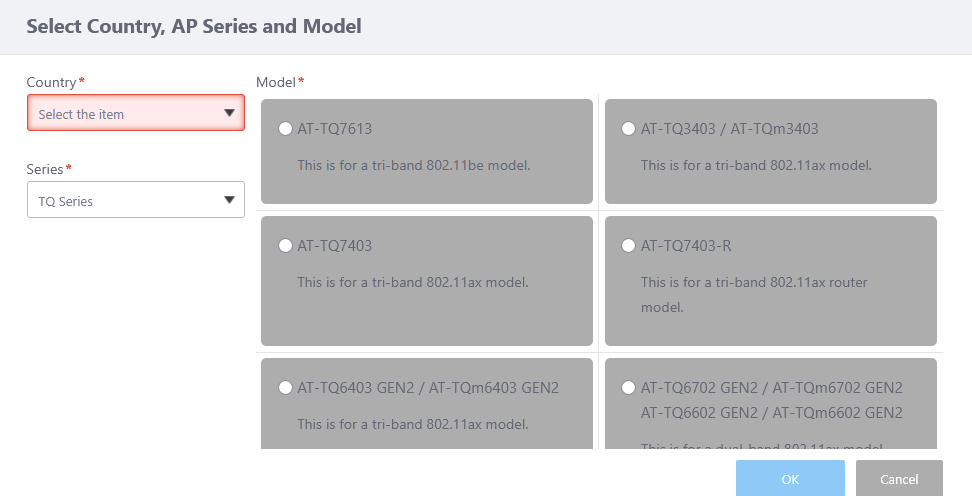 - The "Select Country, AP Series and Model" dialog box will appear.