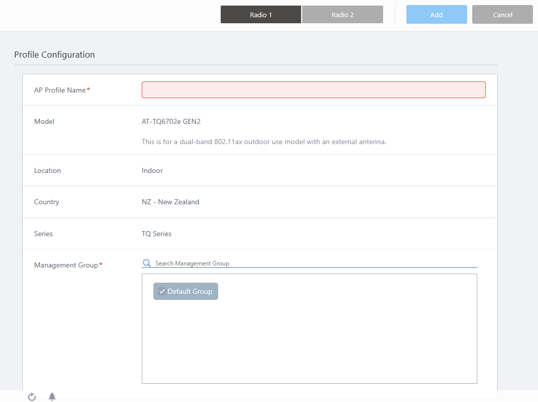 Location If the Model is "AT-TQ6702e GEN2" or "AT-TQ5403e", select Location ("Indoor" or "Outdoor") to place the Wireless APs. "OK" button Create an AP Profile of the selected model. "Cancel" button Stop adding an AP Profile. - TQ Series: