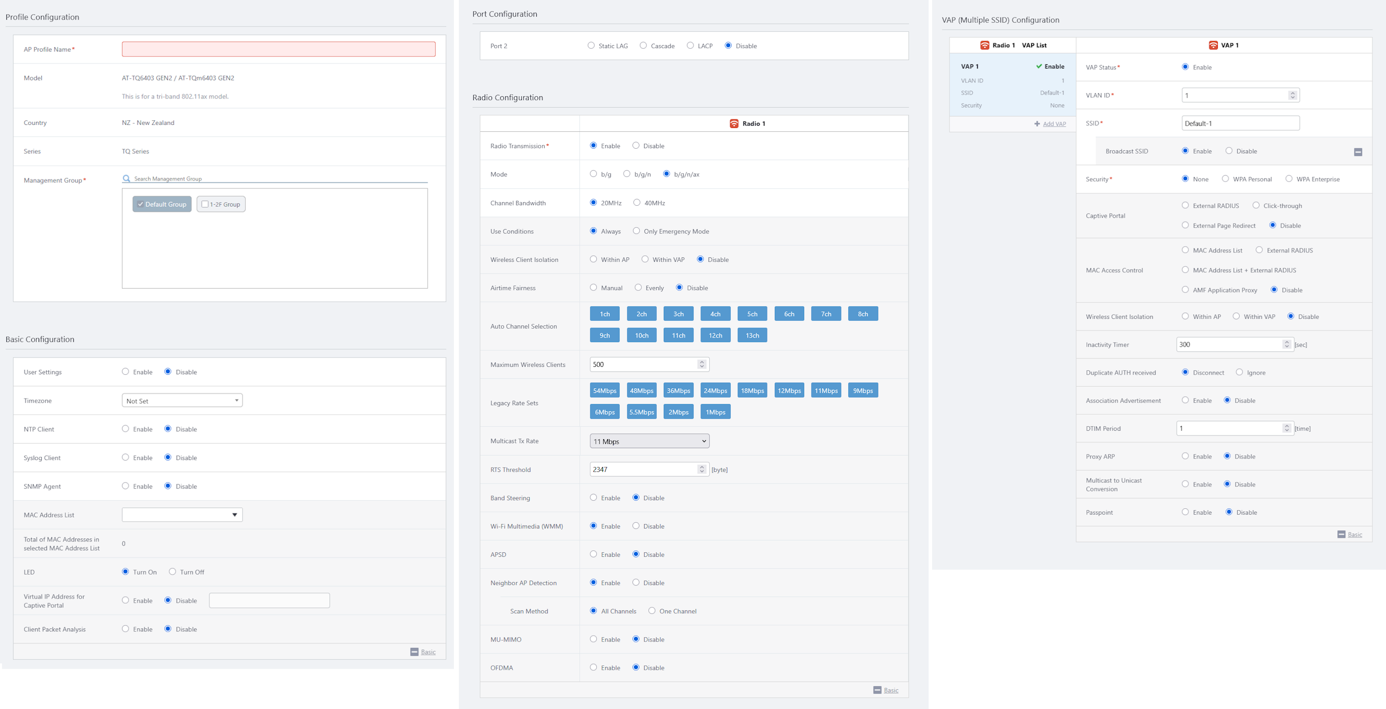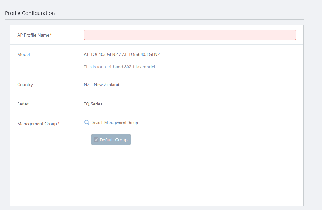 Configuration items of an AP Profile may vary depending on "Series" and "Model". The following image shows a sample AP Profile for "TQ Series" / "AT-TQ3403 / AT-TQm3403".